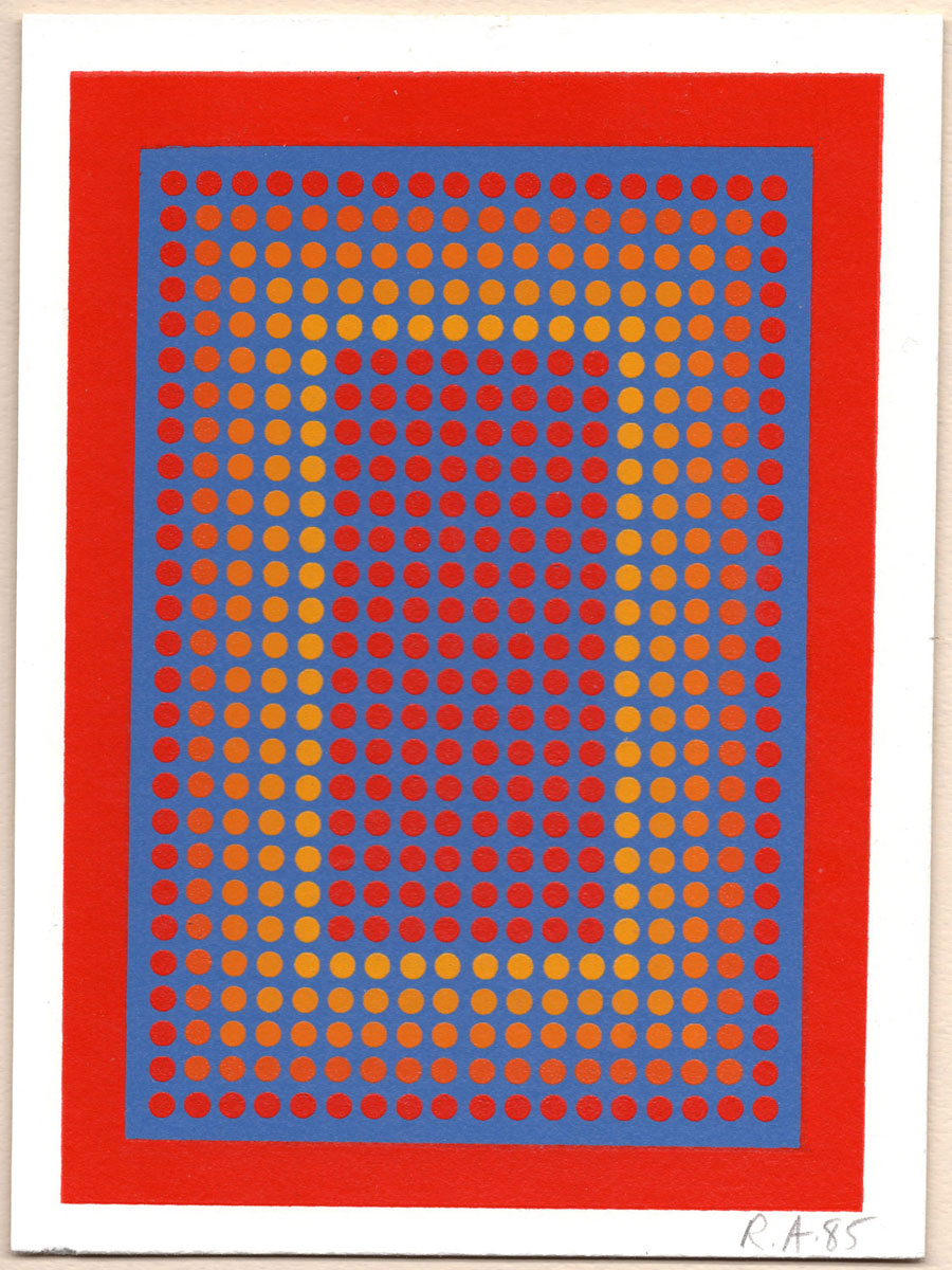 It is printed on heavy paper card stock and measures 5 5/16 by 5 7/16 inches. It is signed by Anuszkiewicz as (R. A. 1987-88) in pencil (lower right). Produced as a Christmas card gift for his friends--it opens up and has a personal message is inside. Has been stored for the past 25 years. Unframed.